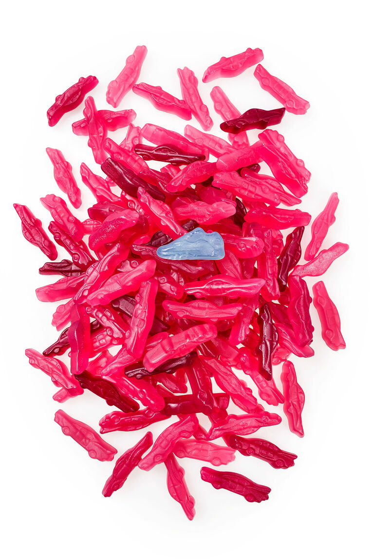 Der ursprüngliche Plan war, unsere Weingummi-Sneakers blau zu machen und ihnen einen anderen Geschmack zu geben. Das wäre natürlich noch toller gewesen, als rosa Turnschuhe unter die ohnehin schon rosa Cadillacs zu mischen. Letztlich konnten wir das nicht realisieren, weil die Pink-Cadillac-Box dann technisch gesehen ein neues Produkt gewesen wäre. Es wäre dann nicht möglich gewesen, sie als Standard-Pink-Cadillacs in Supermärkten, Tankstellen, Drogerien und so weiter zu verkaufen. Wir haben gefühlt Millionen Probepackungen produzieren lassen, wo noch die blauen Sneakers drin waren. Die Geschmacksrichtung des blauen Weingummis durfte ich selbst aussuchen. Für die Pressemitteilung habe ich diesen Text hier geschrieben: