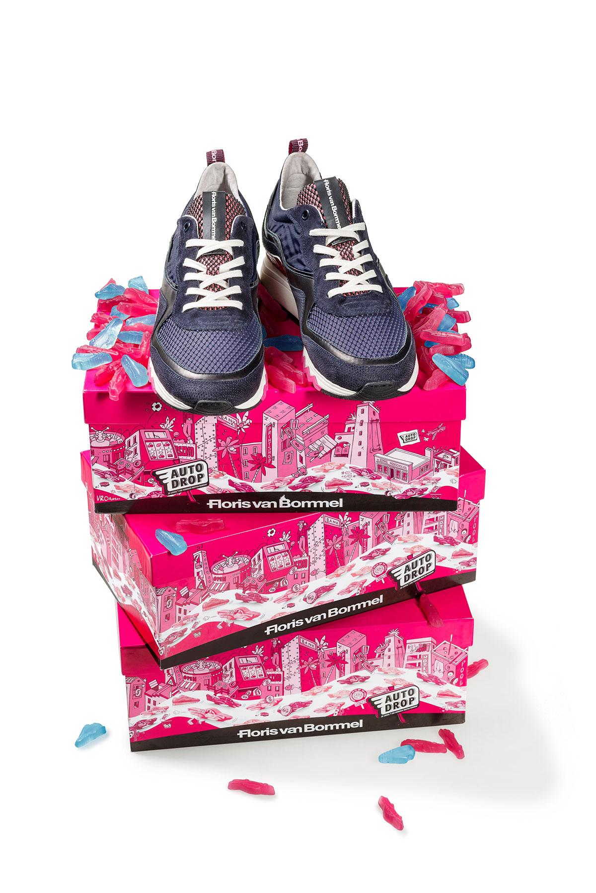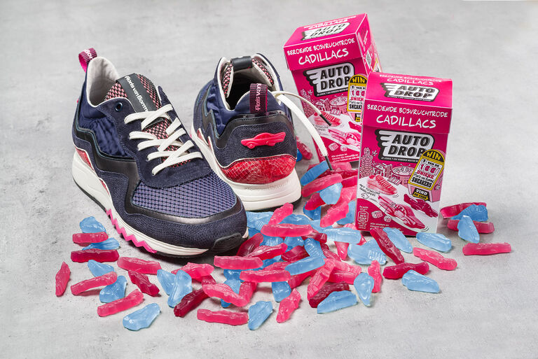 Floris: „Etwa zwei Monate lang gab es im Frühjahr 2019 zwischen den pinken Cadillacs von Autodrop pinkes Weingummi in der Form von Sneakers. In allen Packungen (ich habe übrigens gelernt, dass die Niederländer in nur wenigen Wochen so einige davon verputzen) waren unsere Sneaker. Auf der Vorlage des Weingummi-Sneakers wurde dann ein echter, limitierter Floris van Bommel & Autodrop-Sneaker produziert. Diese Kampagne entwickelte sich zu einer wirklich tollen und umfangreichen Aktion, die alle möglichen Gewinnspiele beinhaltete – und natürlich gaaaaaanz viel Weingummi.