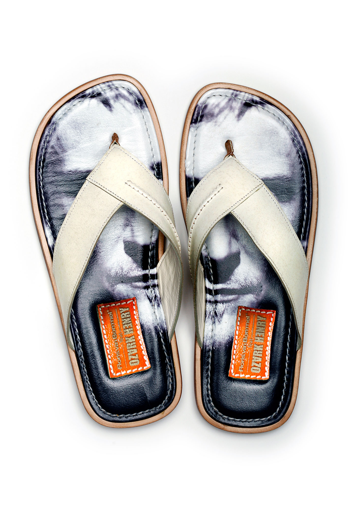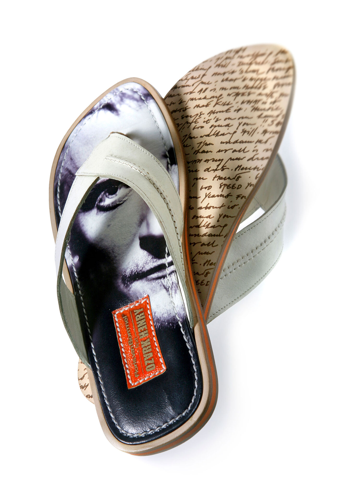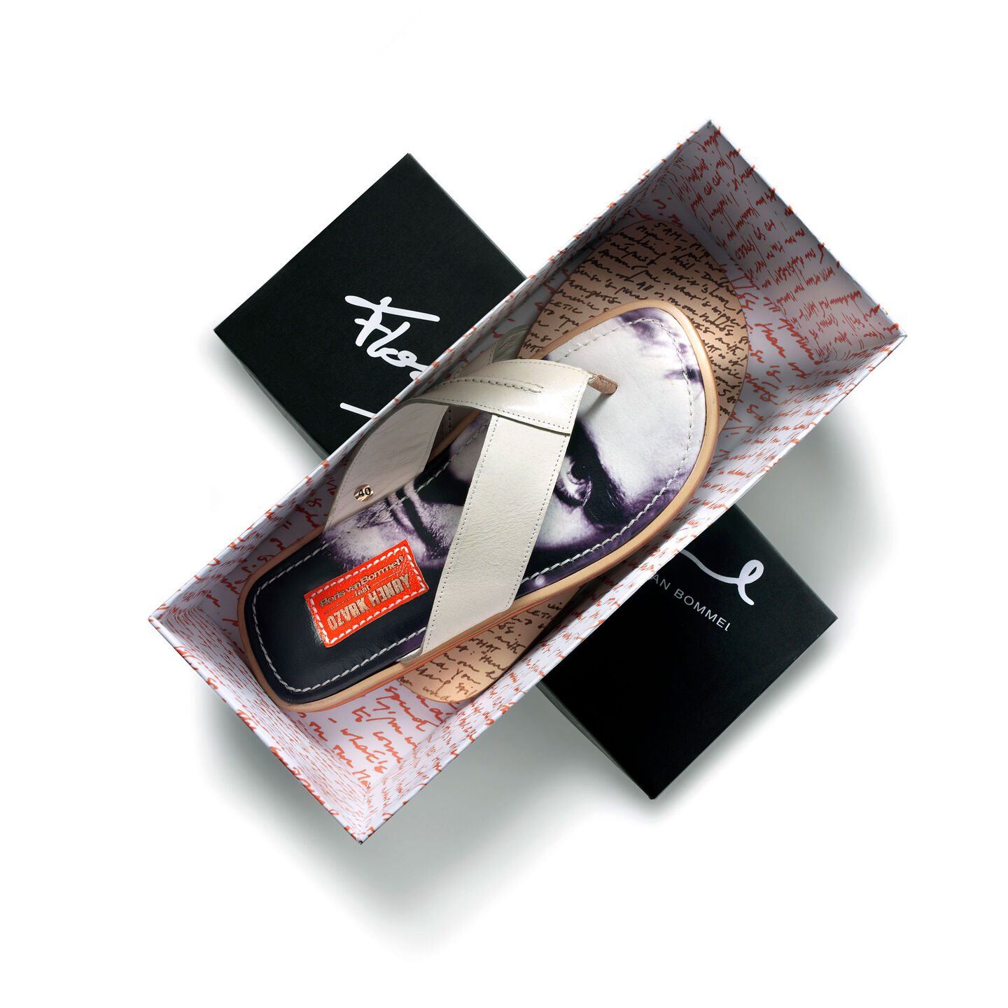 Irgendwann im Jahr 2009 las ich in einem Interview, dass Piet Goddaer, der Mann hinter Ozark Henry, oft in Slippers auftrat. Diese Aussage war für mich natürlich gleich eine Herausforderung. Im Handumdrehen saßen wir gemeinsam am Tisch. Zusammen mit Piet haben wir ‚den perfekten Slipper‘ entworfen. Ein einfacher weißer Lederslipper mit einer geschmeidigen Ledersohle und einem bequemen Fußbett. Wir haben das Lederfußbett mit dem Porträt von Piet versehen und auf die Laufsohle haben wir den handgeschriebenen Text des Songs Godspeed gelasert.“