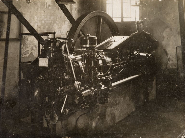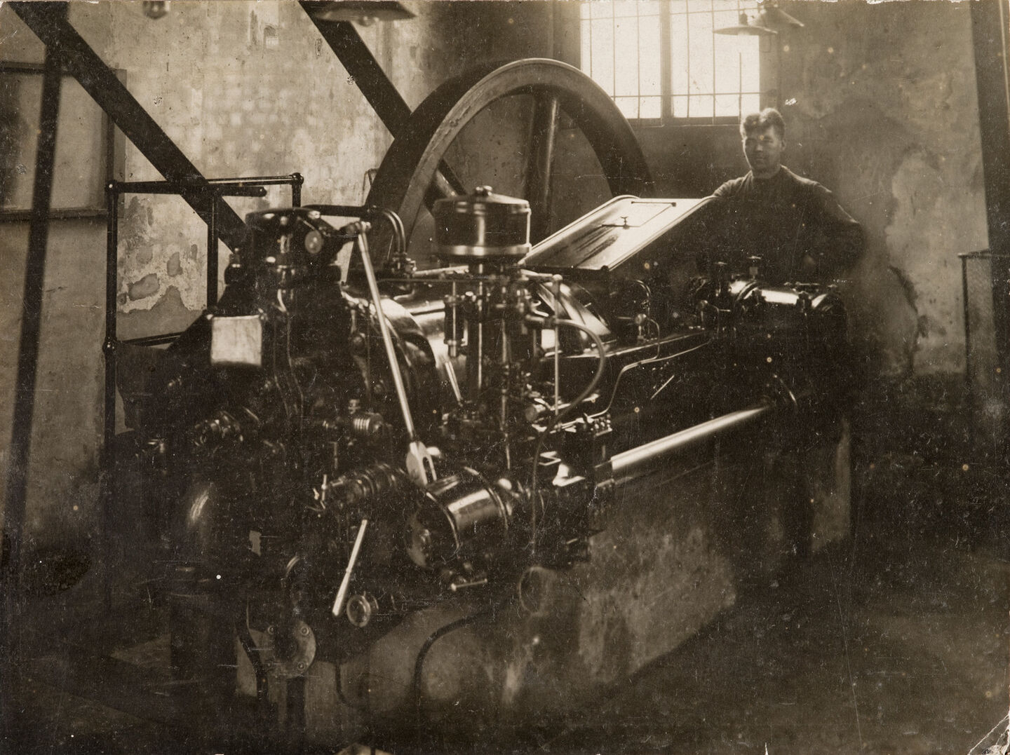 (Bild unten: Maschinist Kees van de Loo im Jahr 1922 an der neuen zentralen Energiequelle der Schoenfabriek van Bommel. Über Antriebsachsen und Antriebsriemen setzte dieser Dieselmotor alle Maschinen der Fabrik in Gang.)