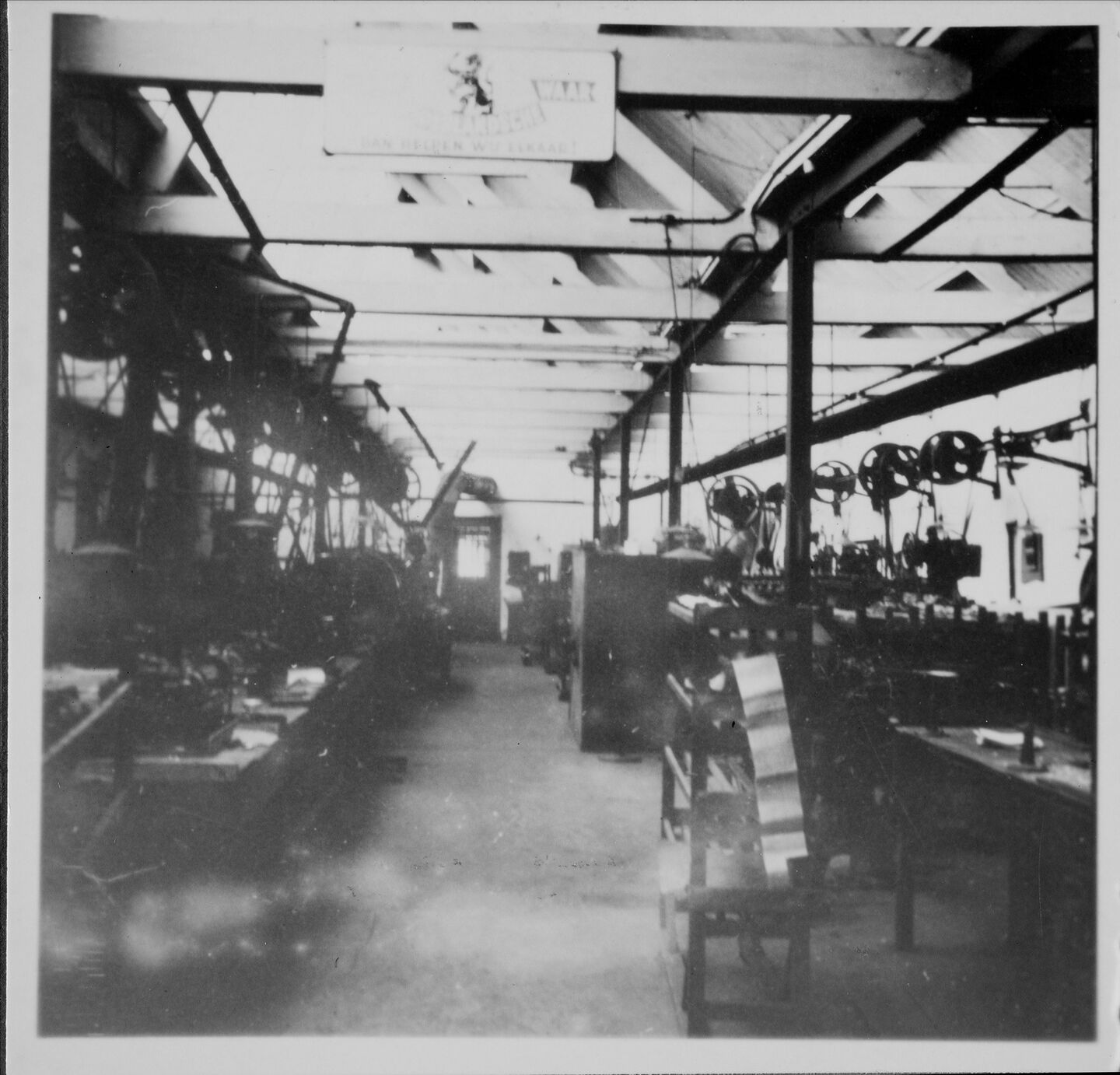 (Bild oben: Ein seltenes Foto aus den 1930er Jahren vom Inneren der alten Van Bommel Fabrik. Links und rechts an der Decke sind zwei Antriebswellen zu sehen. Über jeder Maschine ist eine große Riemenscheibe an der Antriebswelle befestigt. Ein Antriebsriemen verbindet die rotierende Riemenscheibe mit der Maschine und setzt sie in Bewegung.)
