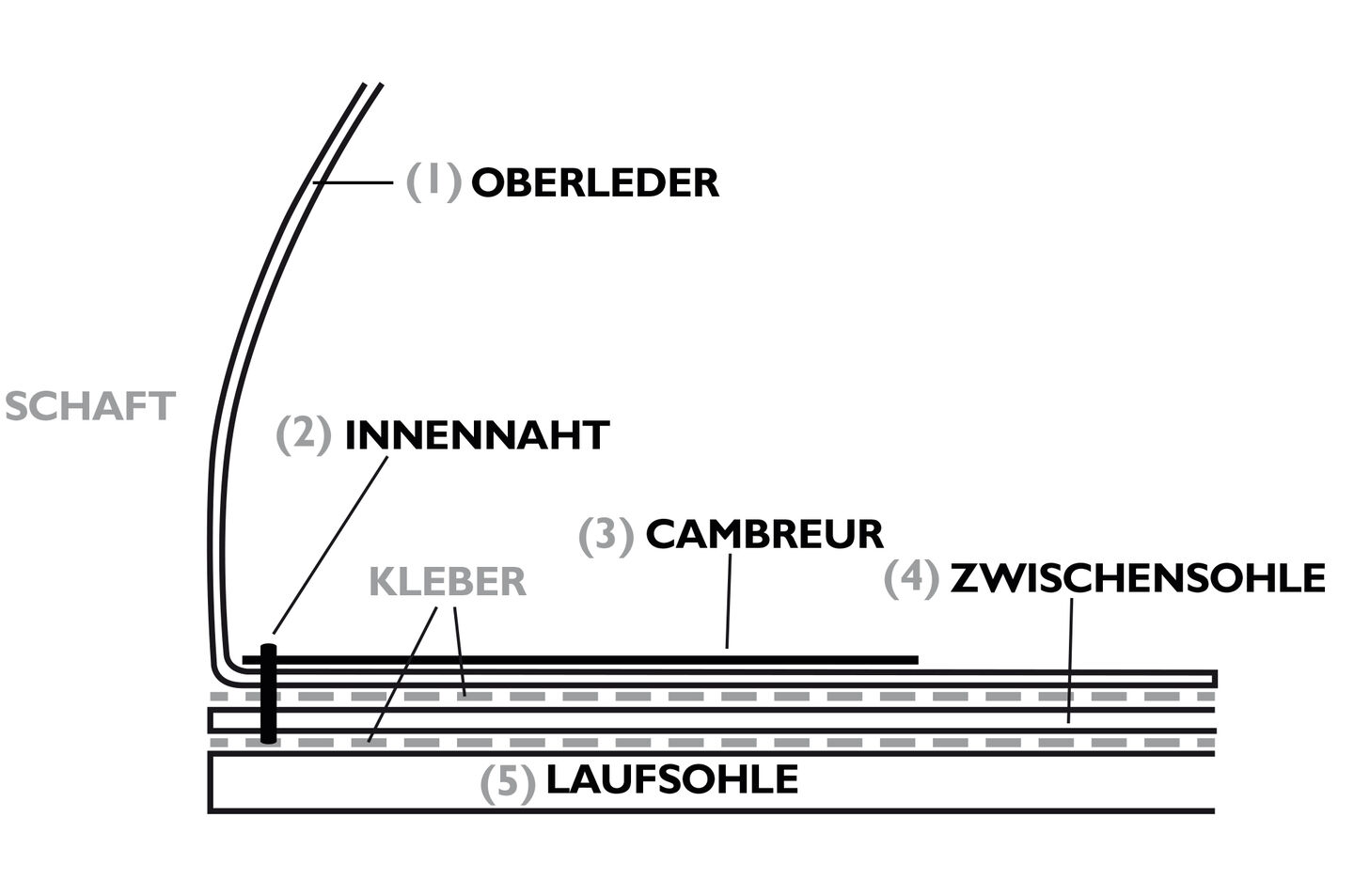 Das Oberleder (I) wird um den Leisten herumgespannt. Oben wird das Oberleder (I) von Hand festgenäht. Die Innenseite des Schaftes ist mit einem verstärkenden Gelenkstück (cambreur) (3) versehen und eine Zwischensohle (4) ist mit dem Oberleder (I) verklebt. Dann wird der Leisten aus dem Schuh entfernt. Die Zwischensohle (4) wird von innen mit einer Innennaht (2) am Oberleder (I) festgenäht. Die Laufsohle (5) wird an die Zwischensohle (4) geklebt. Eine andere Variante ist auch, dass die Innennaht (2) sowohl durch das Oberleder (I), als auch durch die Zwischensohle (4) und die Laufsohle (5) durchgenäht wird.