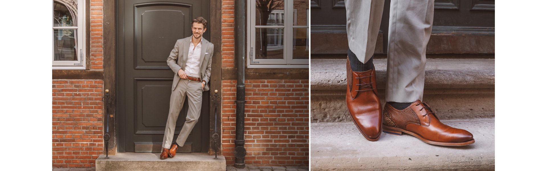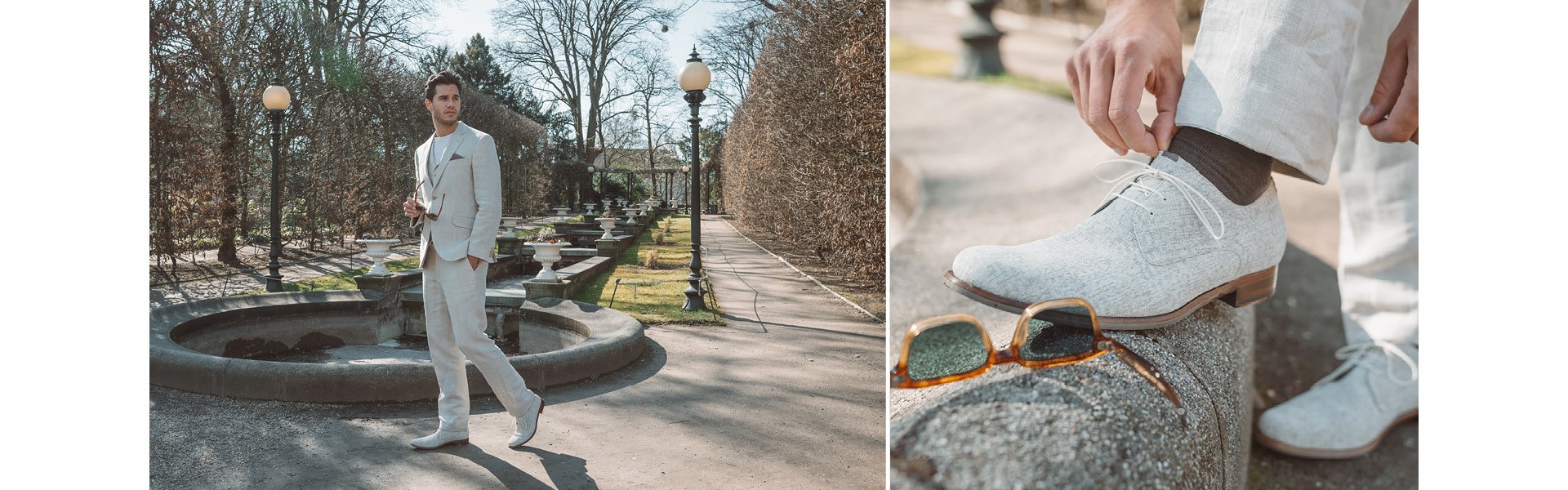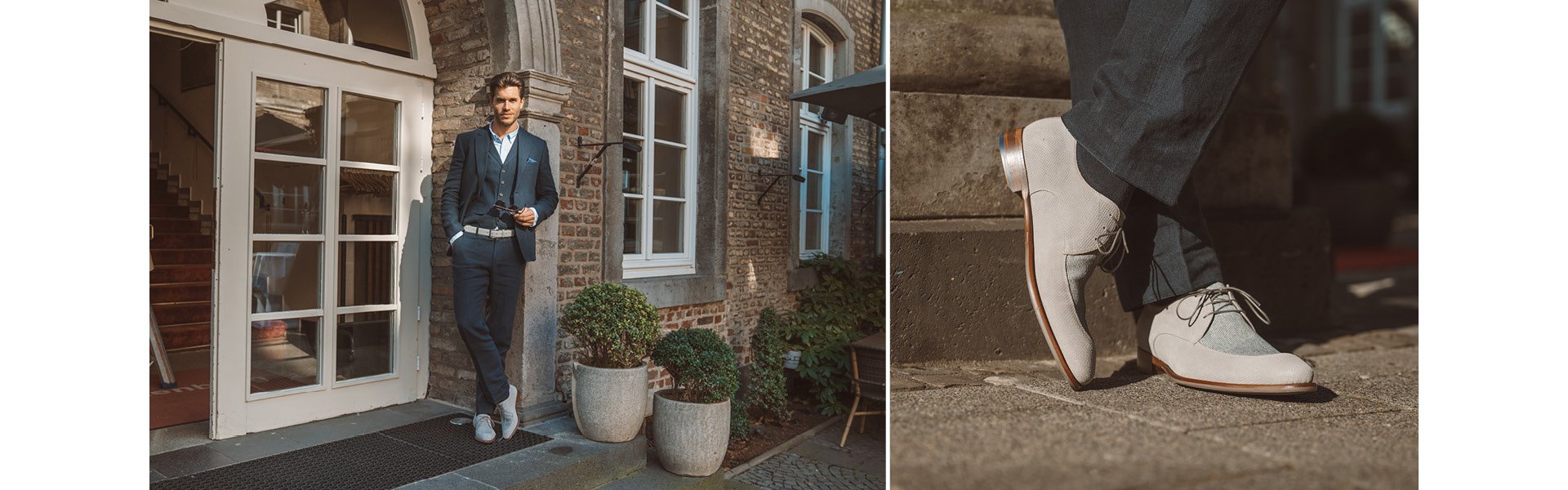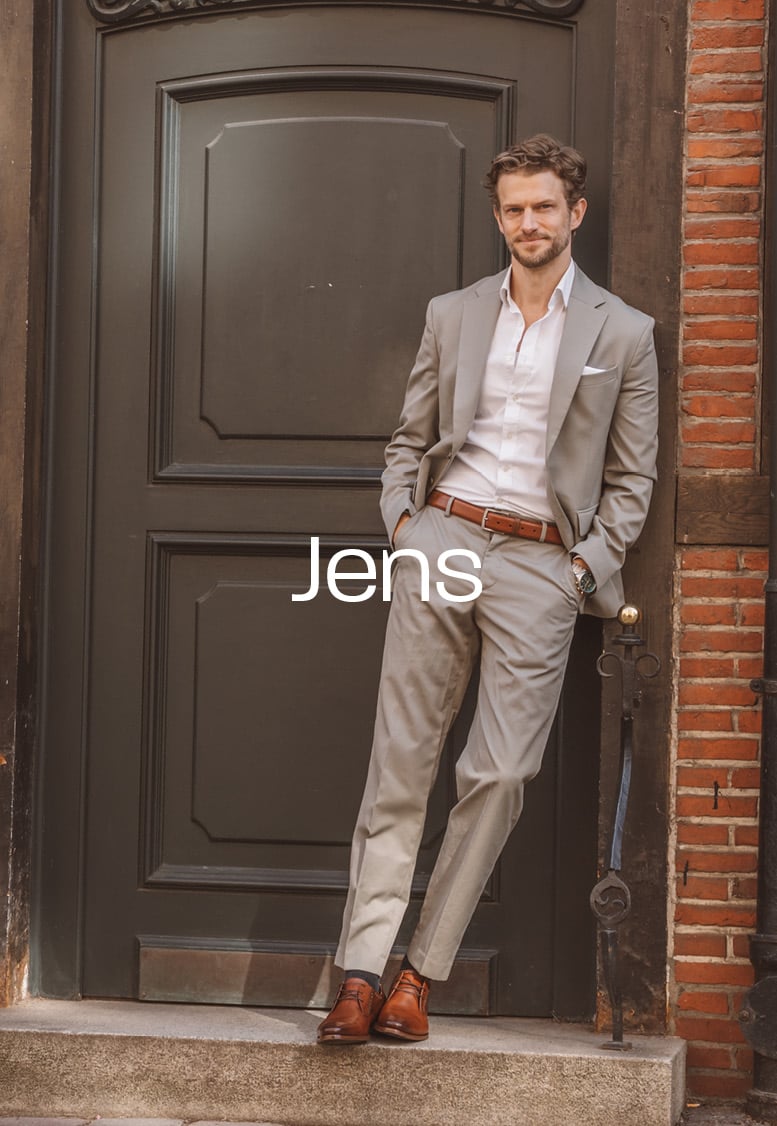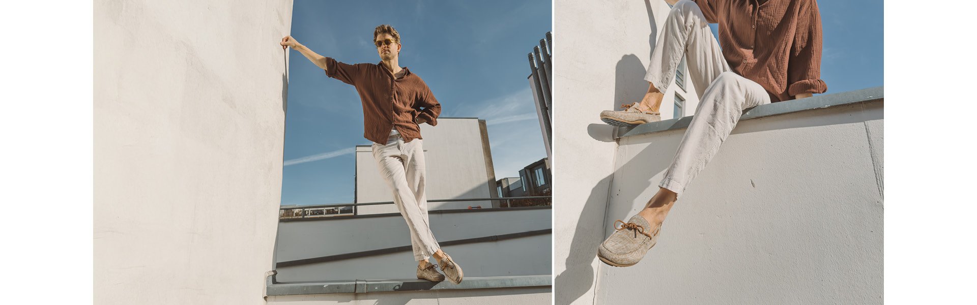 Jens zeigt, wie er den hellgrauen Mokassin, einen klassischen schwarzen Brogue aus Kalbsleder, einen Derby in Cognac sowie den beliebten De Zaler aus unserer Sommerkollektion stylt.
