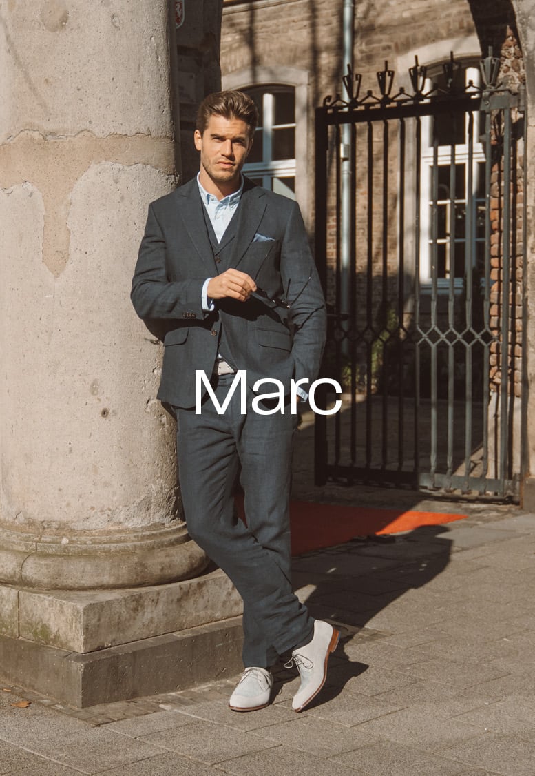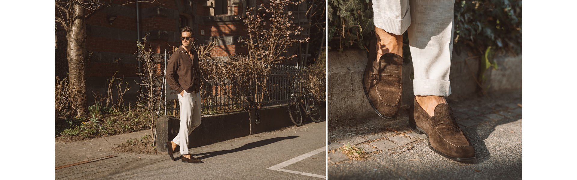 Marc zeigt, wie er einen Veloursleder-Loafer, zwei elegante Schnürschuhe aus hellbraunem und hellgrau bedrucktem Veloursleder sowie den „De Zager“ aus unserer Sommerkollektion stylt.