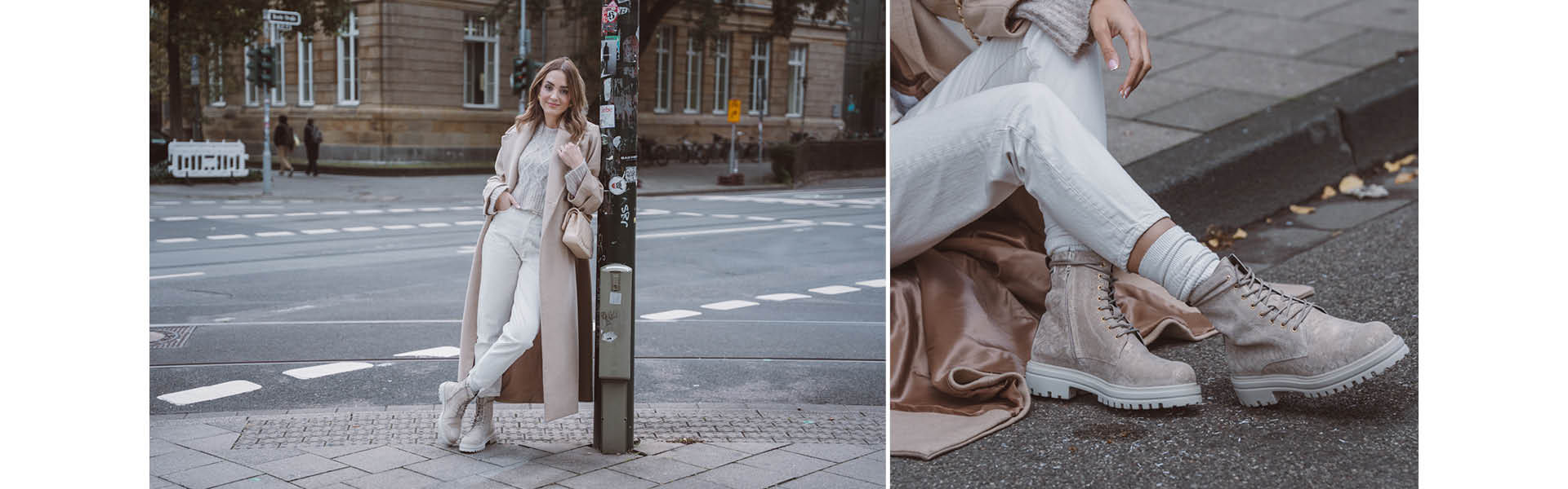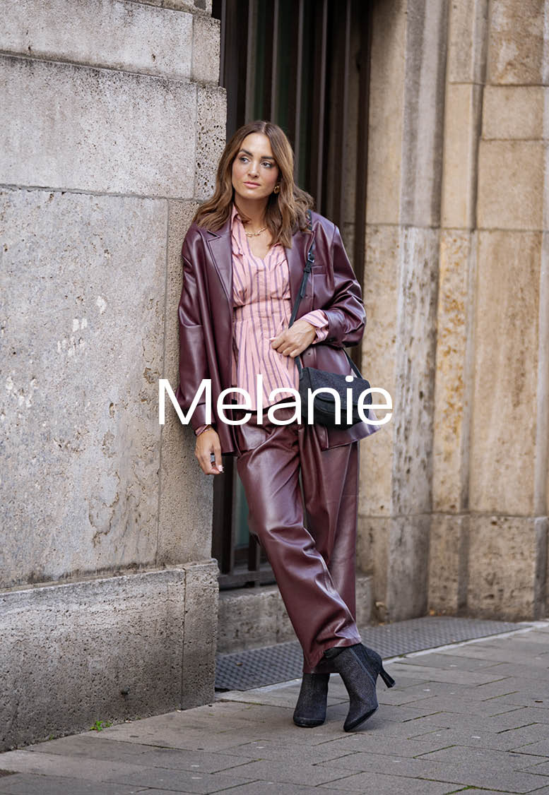Melanie zeigt, wie sie eine elegante Stiefelette mit Reißverschluss, einen „Selsi“-Schnürschuh, silberne Metallic-Sneaker und taupefarbene, bedruckte Wildleder-Stiefeletten aus unserer Winterkollektion stylt.