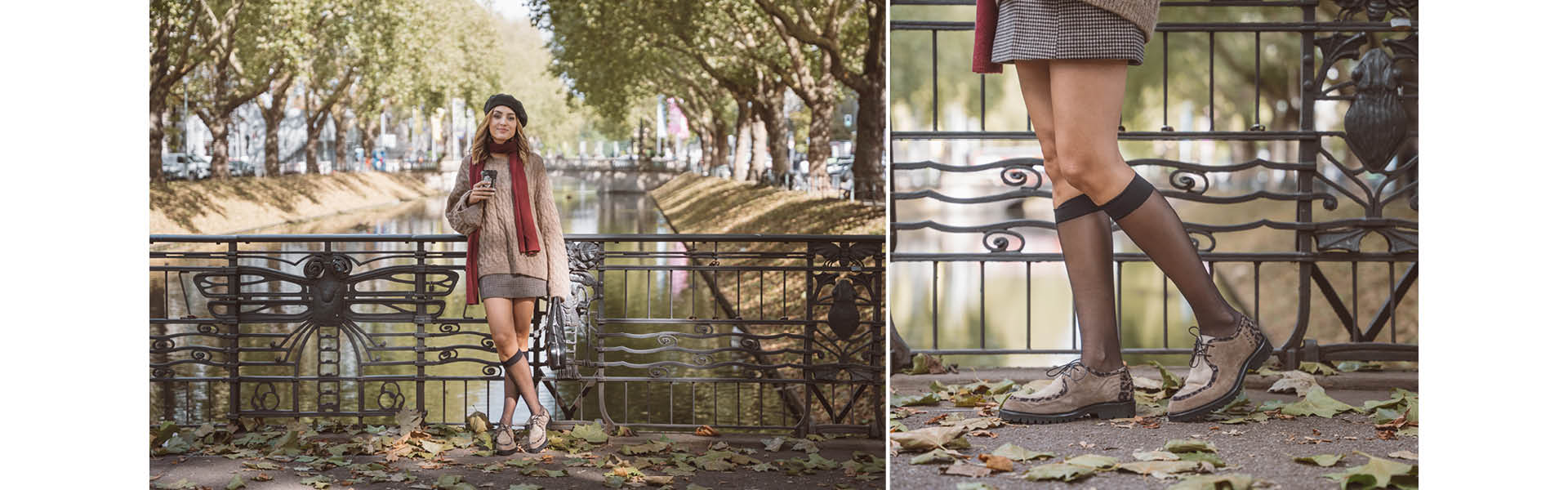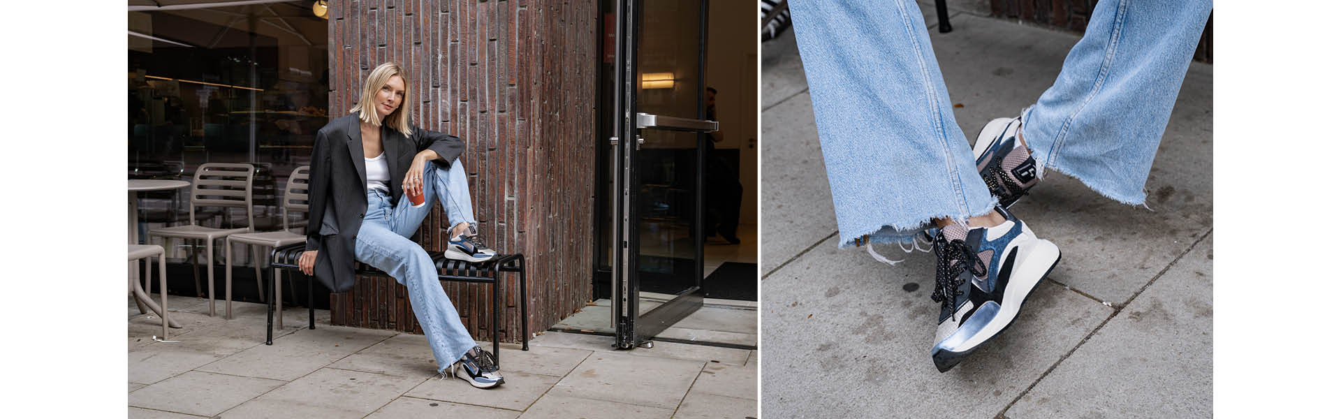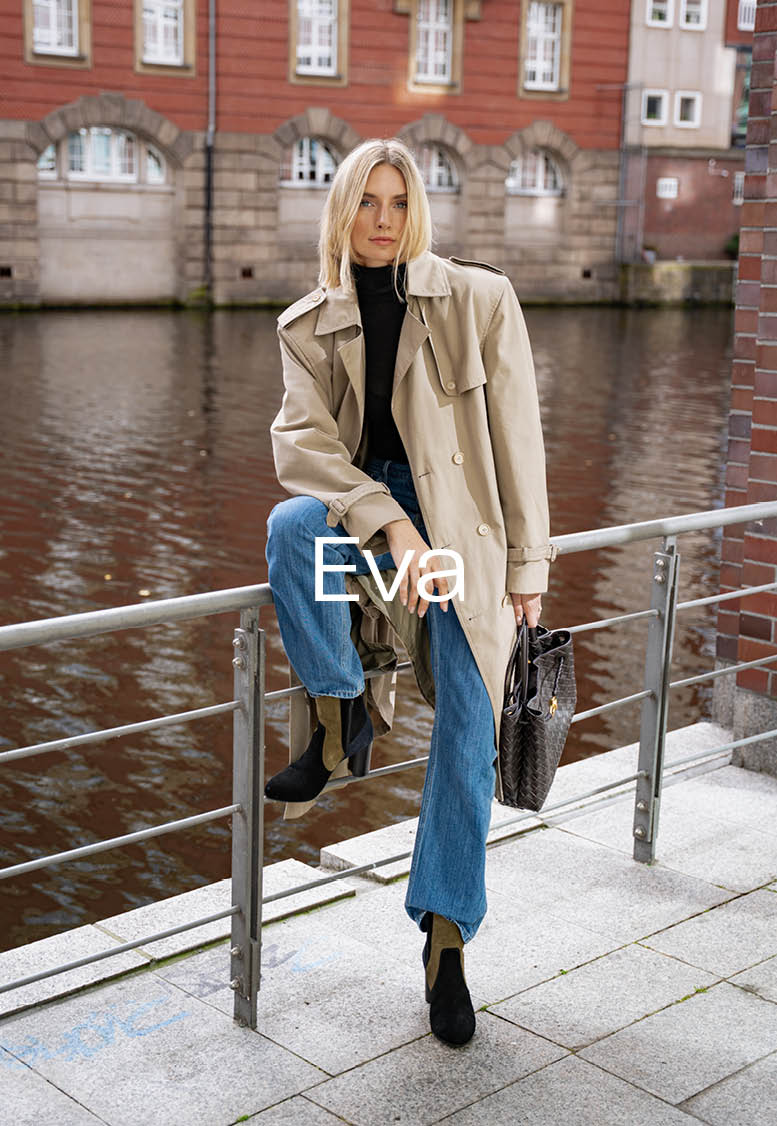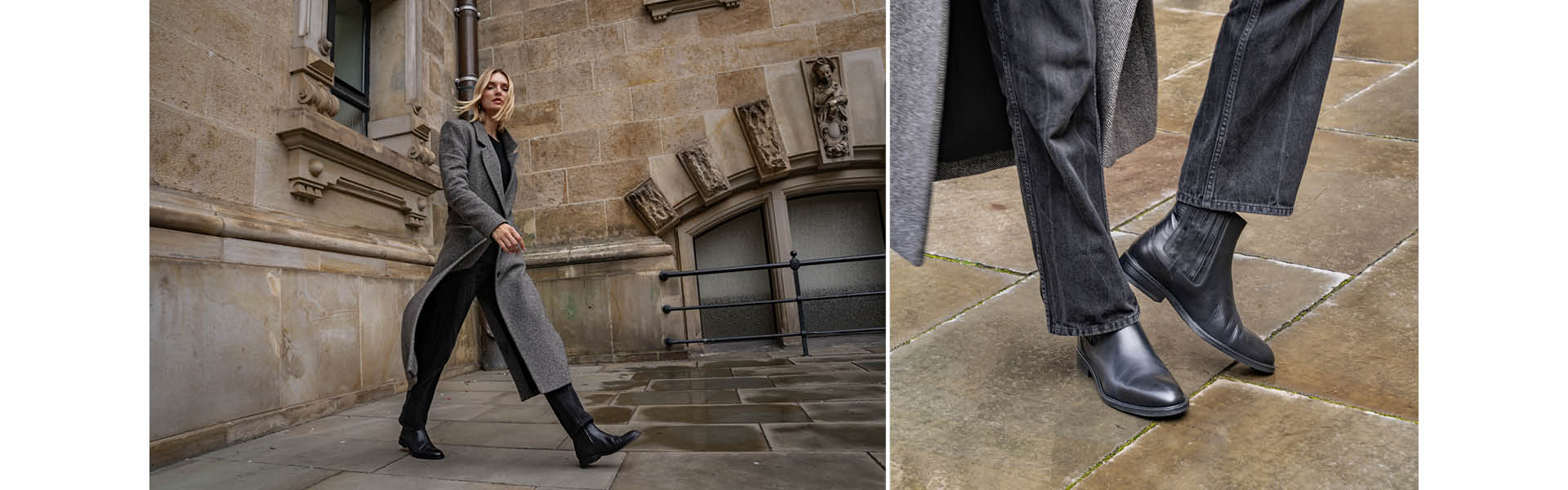 Eva zeigt, wie sie metallisch hellblaue Ledersneaker, Patchwork-Stiefeletten, einen klassischen Chelsea-Boot und einen modernen schwarzen Loafer aus unserer Winterkollektion stylt.