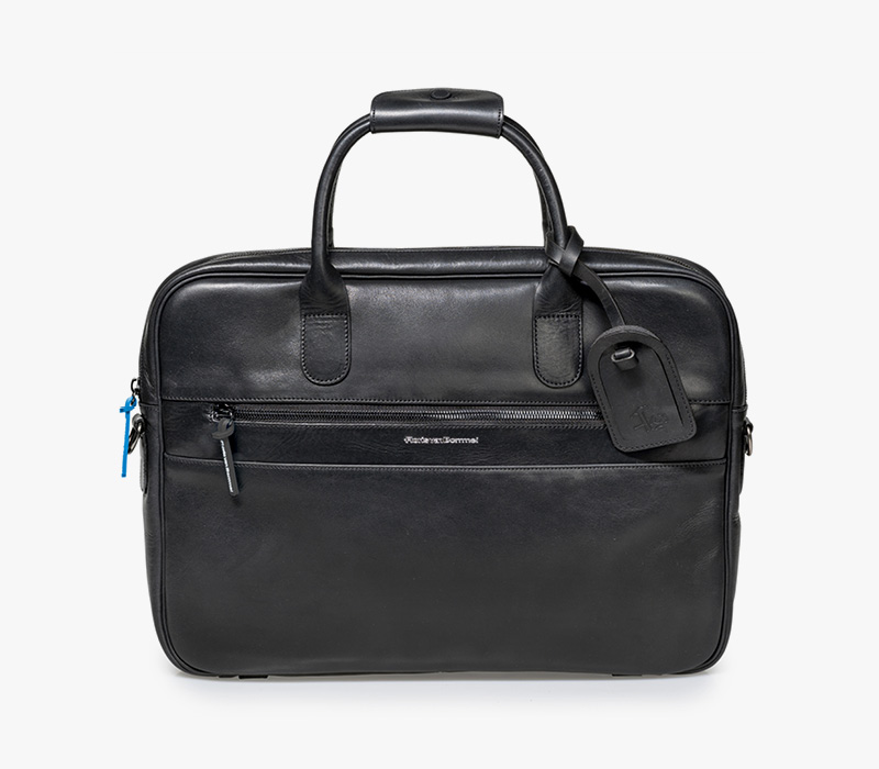 Dies ist die schmalere Version unserer Bürotasche. Im papierlosen Zeitalter ist diese elegante schwarze Ledertasche meist mehr als ausreichend für den täglichen Bürobedarf. An der Taschenwand befindet sich ein gepolstertes Fach für Laptops bis zu 16 Zoll. Der gepolsterte Boden der Tasche sorgt dafür, dass der Laptop beim Abstellen der Tasche gut vor Stößen geschützt ist. Das Innere der Tasche verfügt über drei großzügige Fächer, von denen zwei mit einem Klettverschluss und eines mit einem Reißverschluss geschlossen werden können.