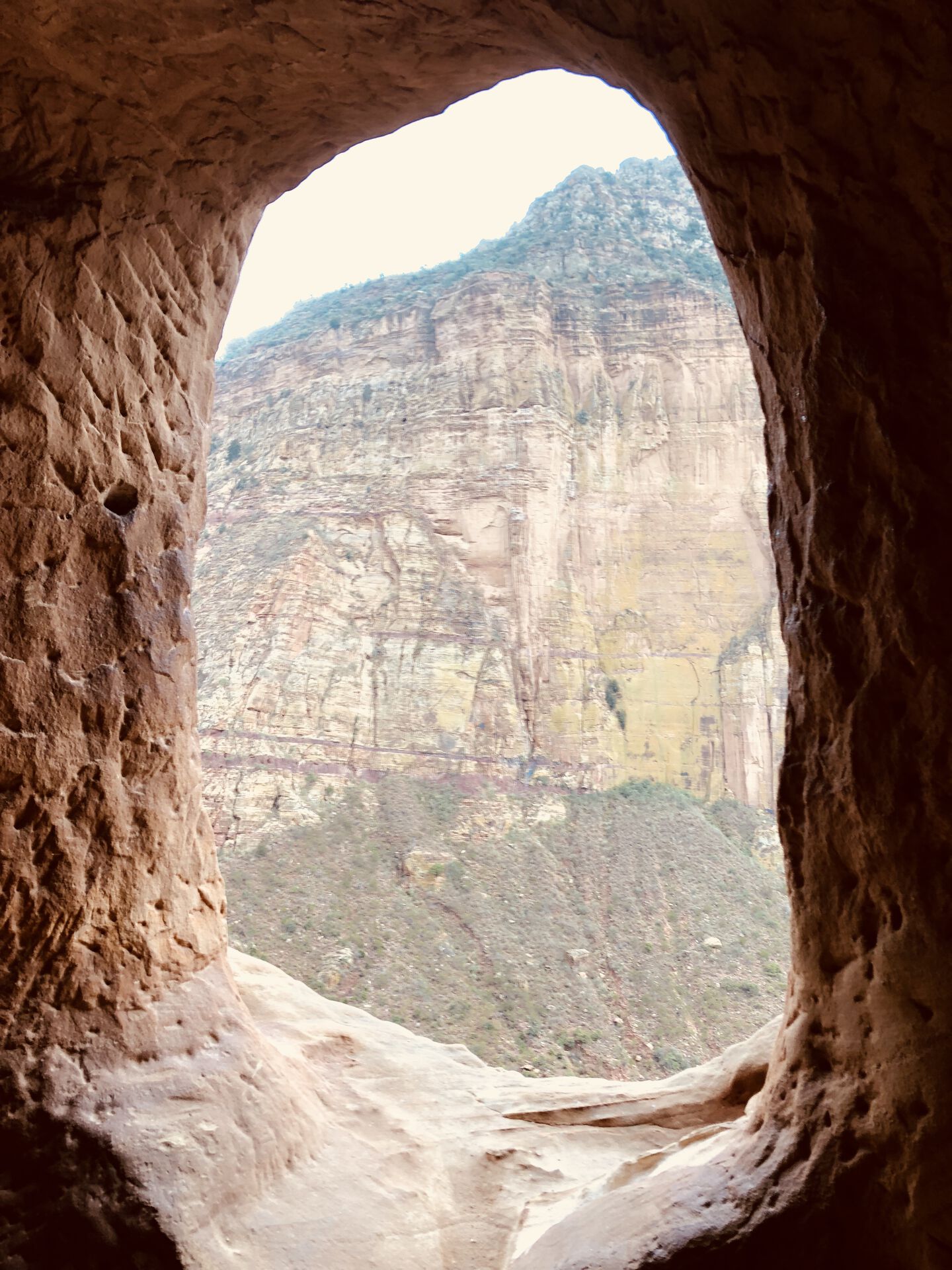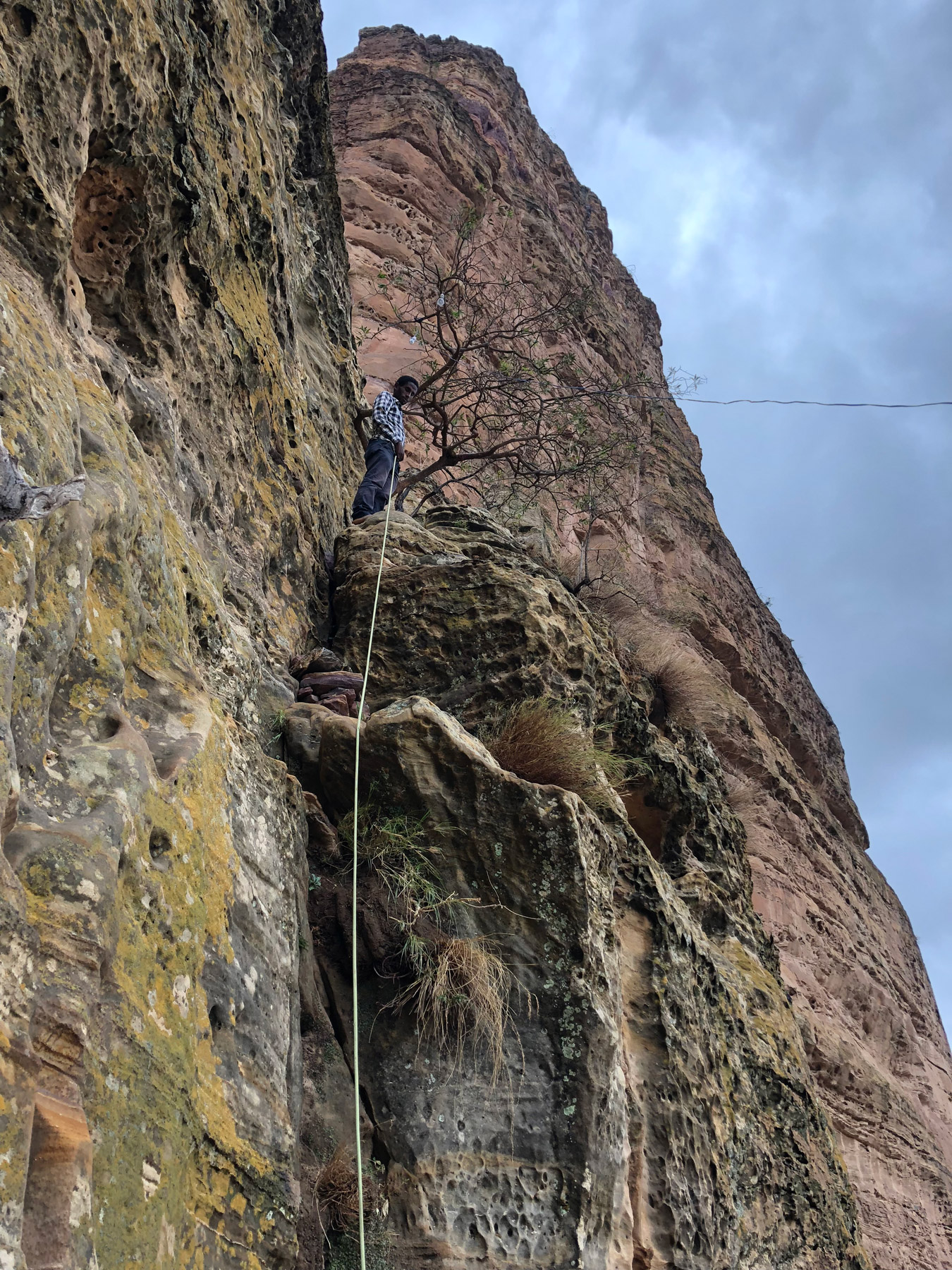 In the hole is a small wooden door leading to a church that is carved even deeper into the rock. That was the whole reason for this climb. The door opens and the priest gives us a tour. It’s beautiful. Our mountain guide tells us about the wall paintings, 'those are the 12 apostles'. I think to myself: 'Well done goofball, you can go on and on about your apostles, while I think about how I’ll decorate this room, because I am going to be stuck here FOR THE REST OF MY LIFE! Everything was still spinning. I have pudding in my legs and am convinced that I’ll collapse if I go up that ledge again. Back in the cave, I look up through the gaping hole. Impossible. You can't see the ledge from inside, there is only distance, depth and height out there. I slide on my butt towards the hole and carefully look at the ledge. To my delight, I see that the ledge is not only 30 cm wide but at least 80 cm. It gives me just enough peace of mind to attempt the way back. While I cry on the inside and think of shoes (That's important, guys! Shoes give you peace and support! Always.), I scramble out first.