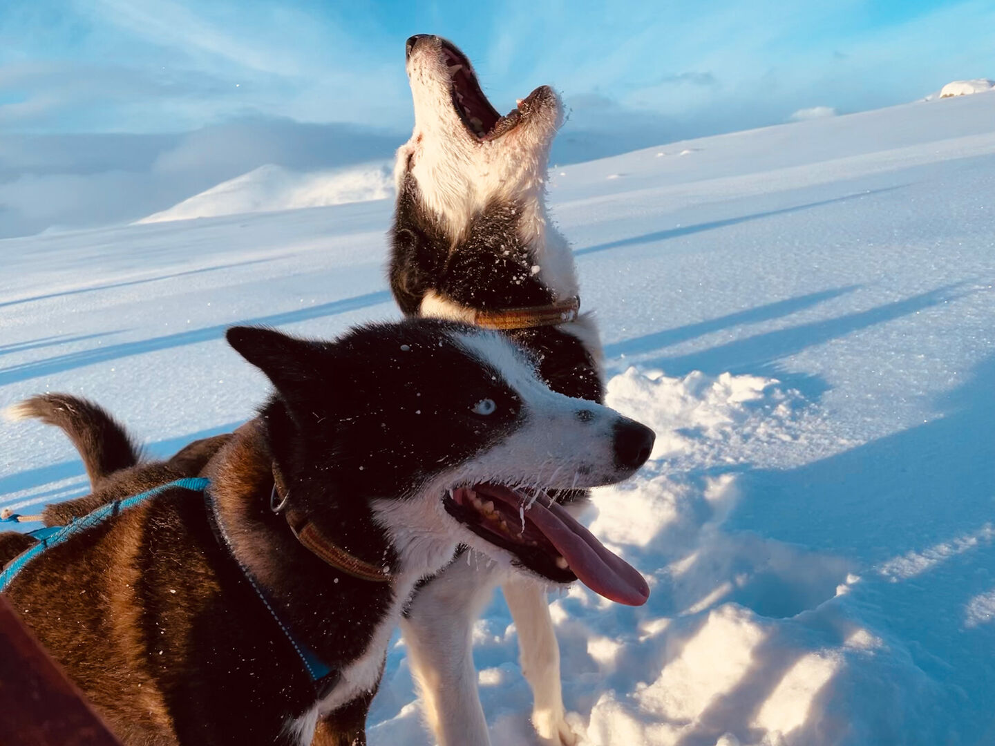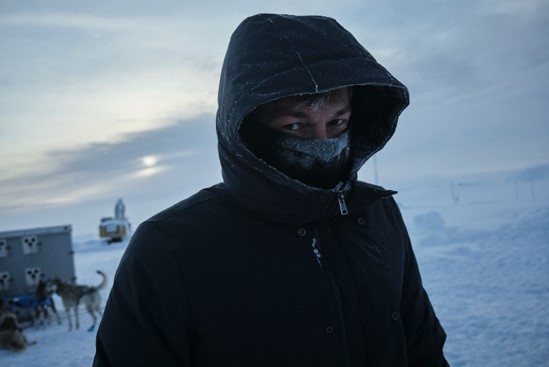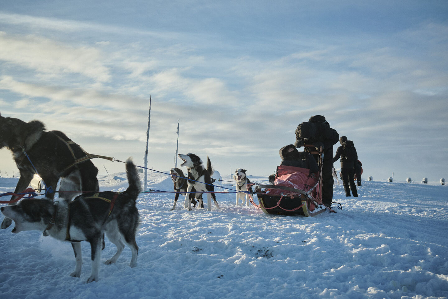 One day later, we go to a sled dog farm. It is a freezing -20 degrees again. The scenery is beautiful, the sunlight perfect and the frozen digger on the grounds is simply perfect for a photo shoot. It is one of those situations and moments that you can never plan in advance. The photo of the excavator ends up being our campaign photo. With the dogs, we only shoot a few videos. I stand alone on a sled with about 8 dogs pulling me and Niels films us from the sled in front of us.