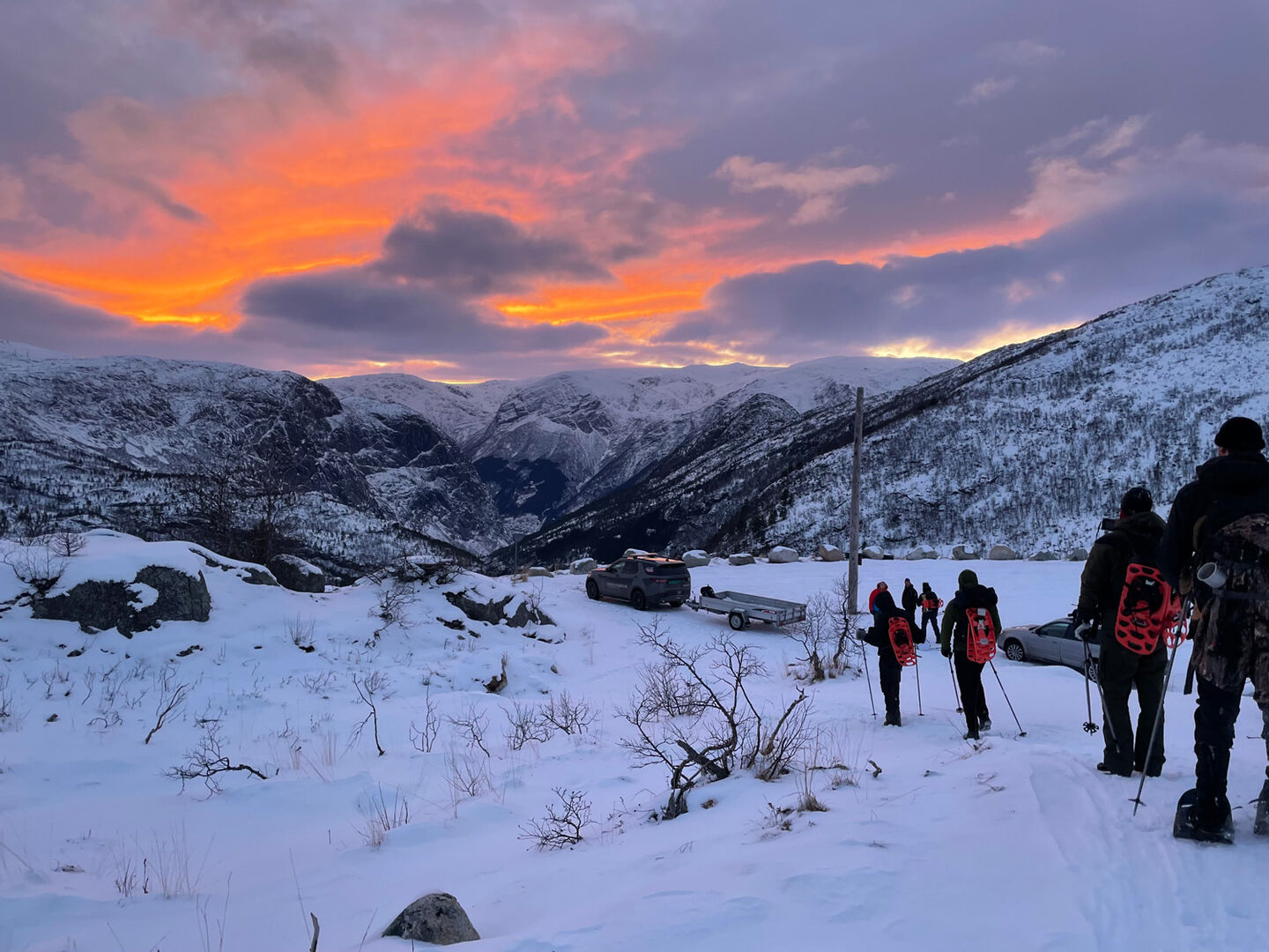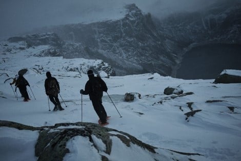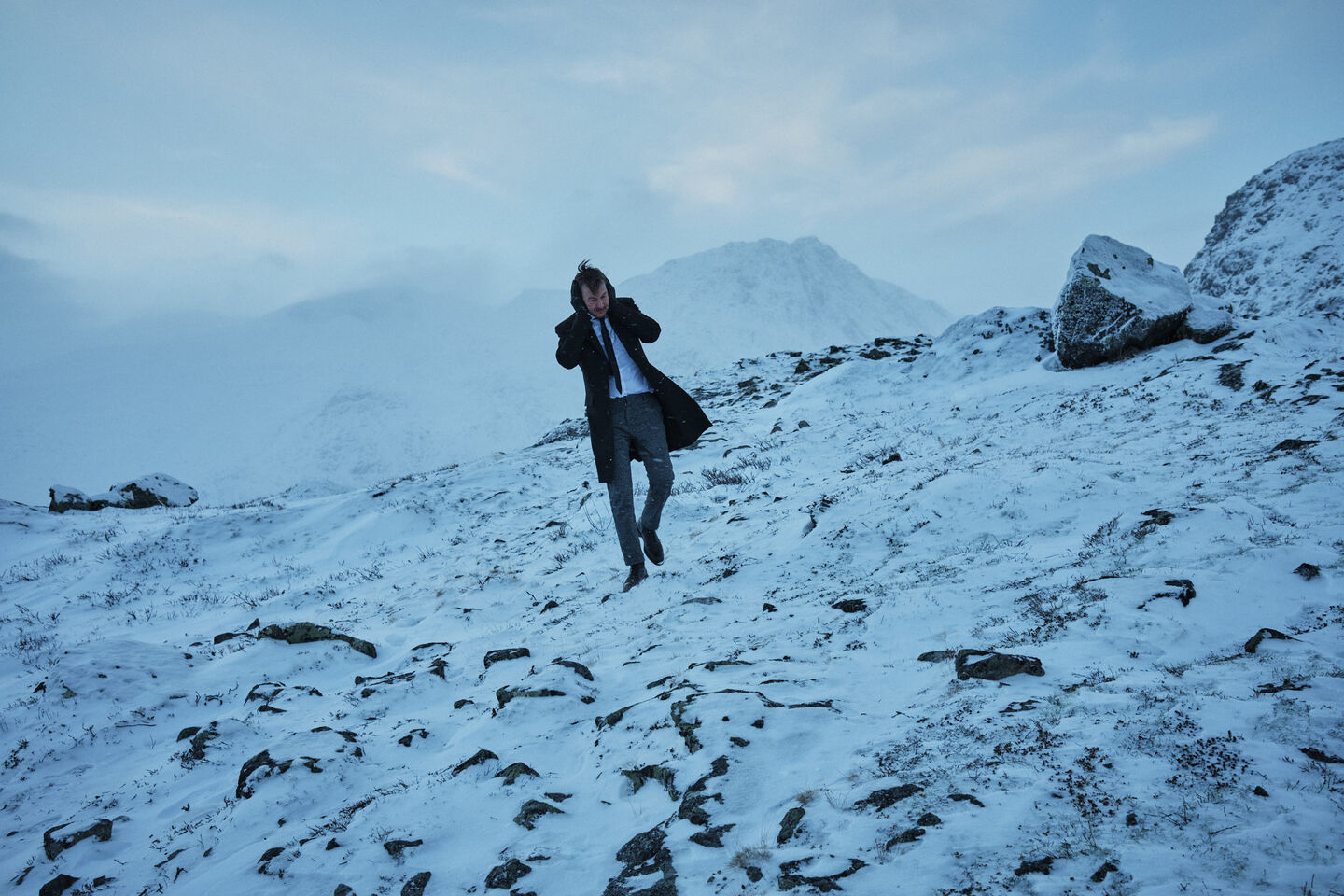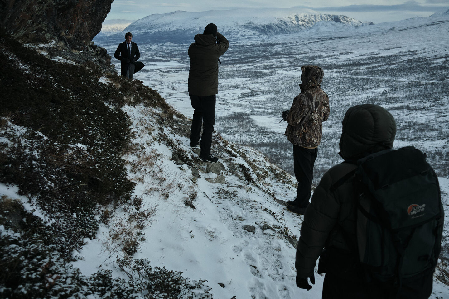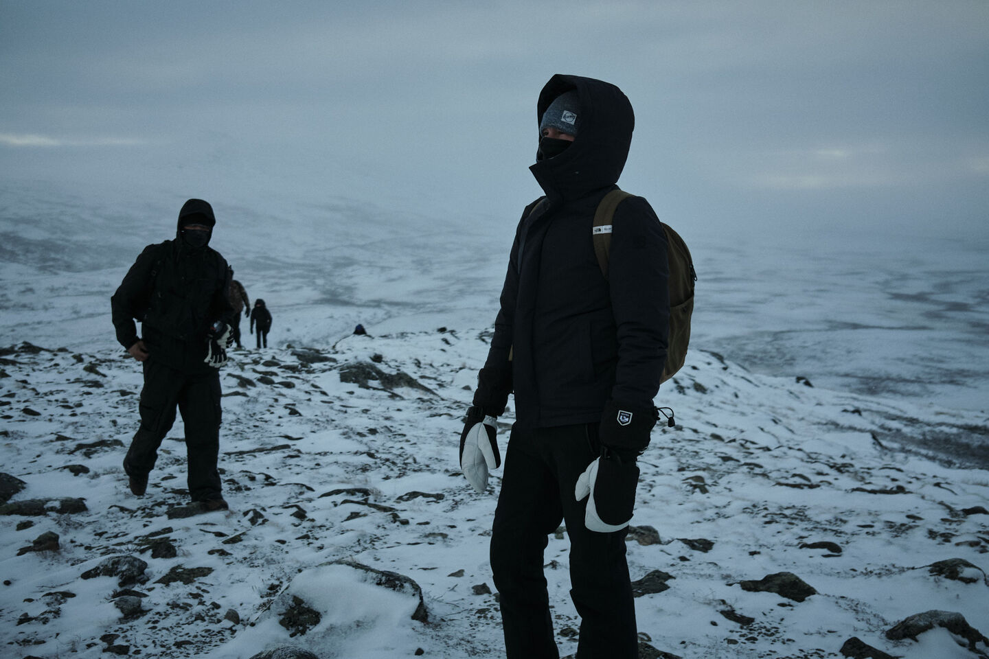 We are going to take a closer look at the fjords of Norway. We realised from previous trips that hikes take us to the best locations, so we have 2 hikes planned. During the first hike, it is -20 degrees and freezing cold. It is a challenging hike, including ropes along slopes that you must use to climb and descend. On top of a windy mountain, behind a rock, I change my clothes and have to stand in the wind for the photo. We can work for a maximum of two minutes. After that, we just have to stop. Everything freezes in those two minutes. Elmar, the photographer, is wearing his thermal suit, but he has to press the button on his camera. And he can't do that with gloves. Very quickly, he can't feel his fingers anymore. To press the button, he first has to locate it and then put his frozen finger on it with his other hand.