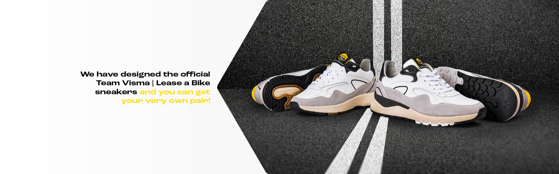 The sneaker comes in a sporty material mix made of white leather and off-white suede. The ‘Team Visma - Lease a Bike’ brand colours yellow and black have been worked into the detailing of the sneaker as fresh highlights. The clean lines accentuate the technical nature of the sport, and the innovative materials used. As a nod to the team’s branding, part of the suede is finished with a fine hexagon print.