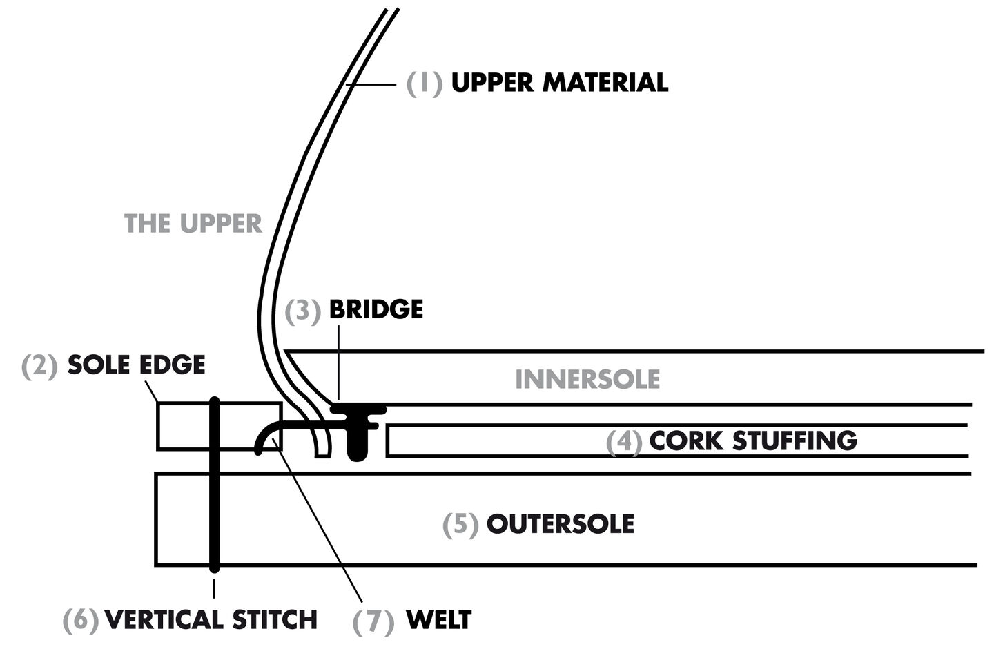 The upper material (1) is pulled on the last. A horizontal stitch (welt) (7) attaches the sole edge (2), the upper material (1) and the bridge (3) (which is attached to the innersole) to eachother. Kork (4) is placed under the innersole to fill up the gap created by the bridge (3). The outersole (5) is placed under the shoe by a vertical stitch (6) through the outersole (5) and the sole edge (2).