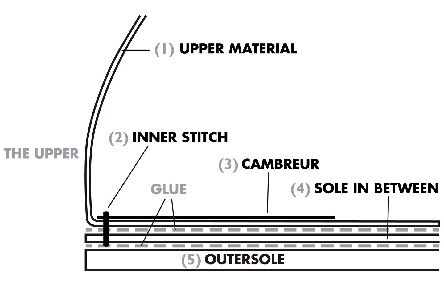 The upper material (1) is stretched around the last and is sewn together on top of the shoe, with a hand stitch. A strengthening shank (cambreur) (3) is placed on the inside of the upper. A sole (the sole in between) (4) is glued to the upper material (1), after which the last is extracted from the shoe. The sole in between (4) is sewn to the upper material (1) from the inside, with an inner stitch (2). The outersole (5) is being attached to the sole in between (4) with glue. There is also a possibility to sew the inner stitch (2) through the outersole (5), as wel as the upper material (1) and the sole in between (4).